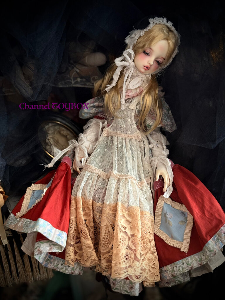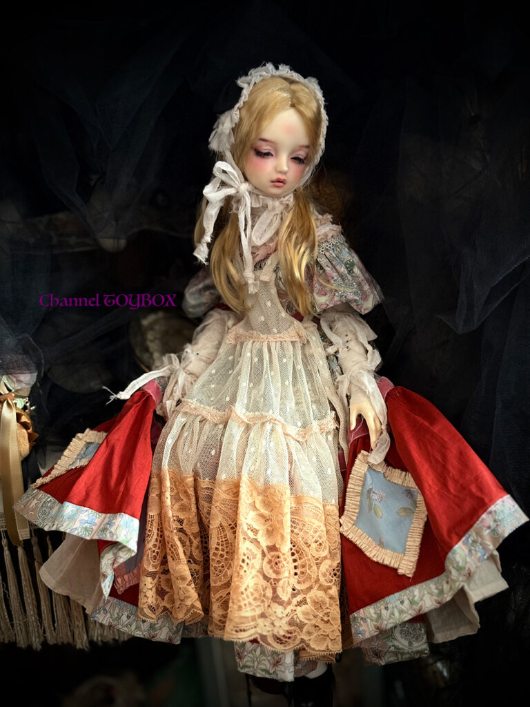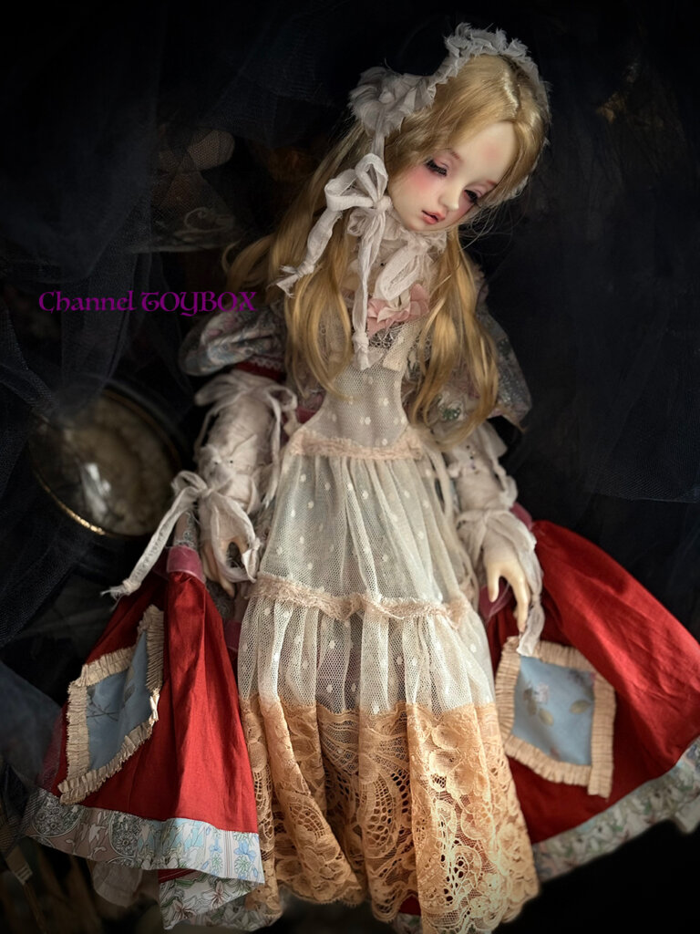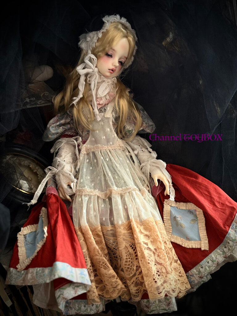 ワンピースの首周りは肩を落として切るタイプにしています。リボン、ブレードなどは木馬製メインに使用。スカートの切り替え部分は甘いピンクのキャンディカラーのベロアを差し込んでいます。